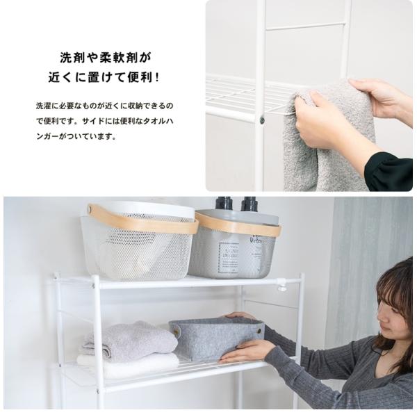 o生活用品 o風呂・洗濯・収納 o洗濯用品 oランドリーラック o新生活・洗濯用品 oひとり暮らし ◇◇ 【特長】 ●左右に伸縮可能。タオルや小物をすっきり収納できるおしゃれな洗濯機ラック ●屋内用 【仕様】 ●使用時サイズ(約)幅62〜98×奥行29×高さ150(cm) ●材質 本体:スチールパイプ(粉体塗装) アジャスター:ポリプロピレン ●耐荷重 全体:10kg 棚網:各5kg ※耐荷重は測定値であり、保証値ではありません。 【備考】 ●お客様組立商品 ●ボルト(大クッション×5・小クッション×5)はあらかじめパイプに取り付けられています。