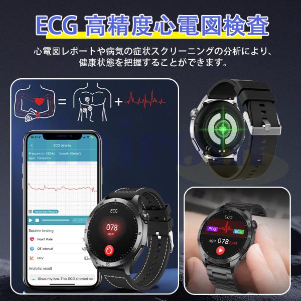 ●24H健康管理:健康-モニタリング、血中脂質、尿酸、ECG心電図、血圧測定、血中酸素、通話可能、カロリー、24時間体温監視、アラート、睡眠監視や心拍数などの測定機能付き
