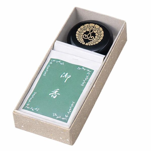 香合とお香20gのセット香合 紫雲香セット 2.5寸 紋入り 下り藤 浄土真宗用 仏具 法要記念品 下がり藤 その他宗紋は10個以上から注文可
