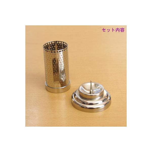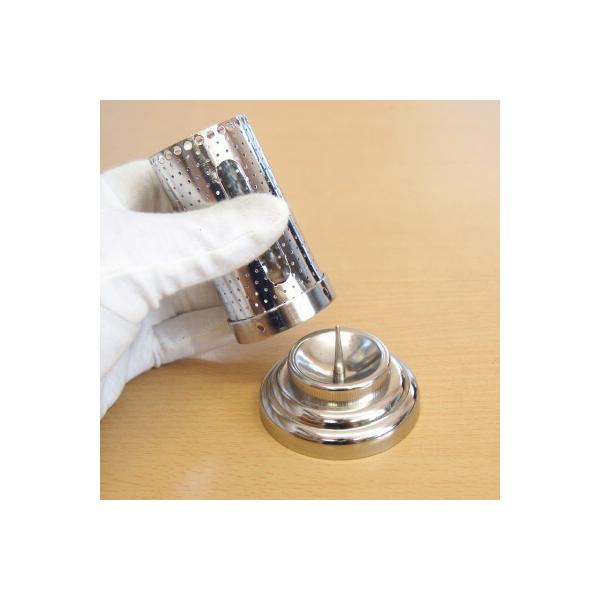 ●ステンレス製メッシュ風防なので、プラスチック製と比べ、ろうそくの火が風防に当たっても溶ける心配がありません。また、ステンレスの筒の中で美しくローソクを灯します。