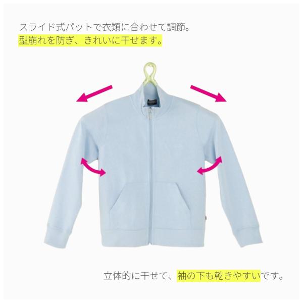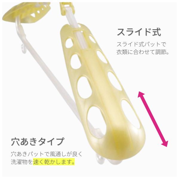 肩の部分を立体的に干せる穴あきパット付きの洗濯ハンガー。型崩れを防ぎきれいに干せて、乾きが早いのが特長です。パットはスライド式で衣類に合わせて調節できます。取り外しも可能です。