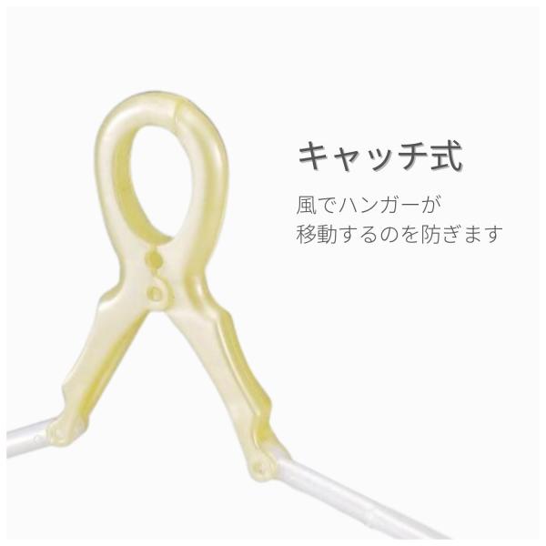 フック部分は竿を下からしっかり挟むキャッチ式。風によりハンガーが飛ばされたり動いてしまったりするのを防ぎます。