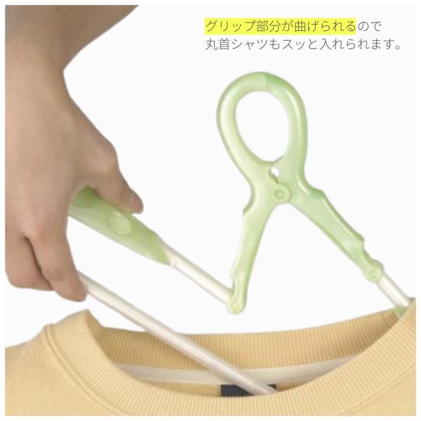 グリップ部分は曲げられるので、丸首シャツにもスッと入れられます。ハンガー下のバーの左右にタオルなどの洗濯物が止められるクリップ付。スカートやタンクトップのヒモを掛けるフックも付いています。