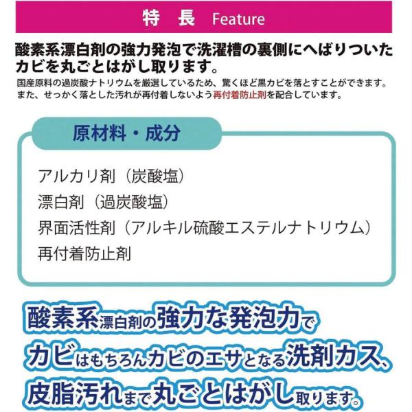 酸素系漂白剤の強力な発泡力で、カビ、洗剤カス、皮脂汚れをきれいに除去します。