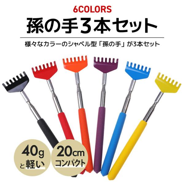 孫の手 伸縮 3本セット 20-68cm 便利 携帯 背中がかゆい 背中掻き 隙間 物を取る ステンレス製 収納袋付き かわいい シャベル型