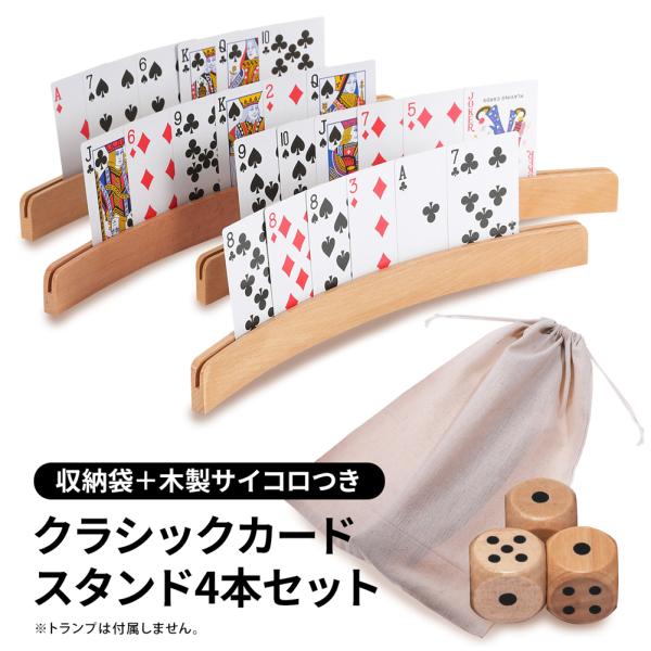 カードスタンド カードホルダー 木製 カード立て トランプ スタンド 湾曲 高齢者 子供用 ゲーム 4本セット サイコロ 収納袋つき ※トランプは付属しておりません