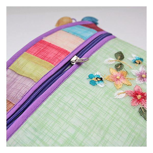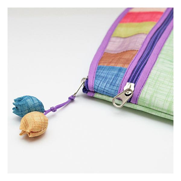 カラフルなキルト模様や刺繍、お花のような紐の先の飾りが、とってもかわいいポーチです。