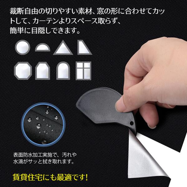 【防水・裁断自由】 防水加工が施されており、水や汚れも簡単に拭き取れます。自由に裁断できるため、窓のサイズや形状に合わせてカット可能。使わないときはコンパクトに収納できます。