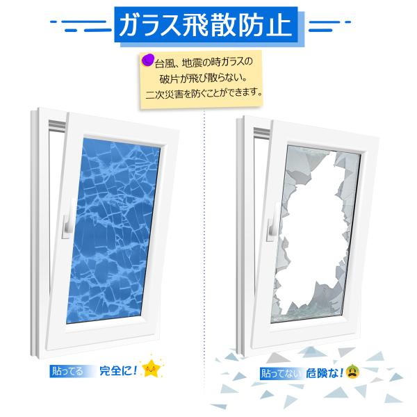 [飛散防止]:シートを貼ることによりガラスの飛散防止に。 台風、地震などの時、ガラスが割れても破片が飛び散らない!割れたガラス破片による二次災害と思わぬ怪我を防ぐ事ができます。