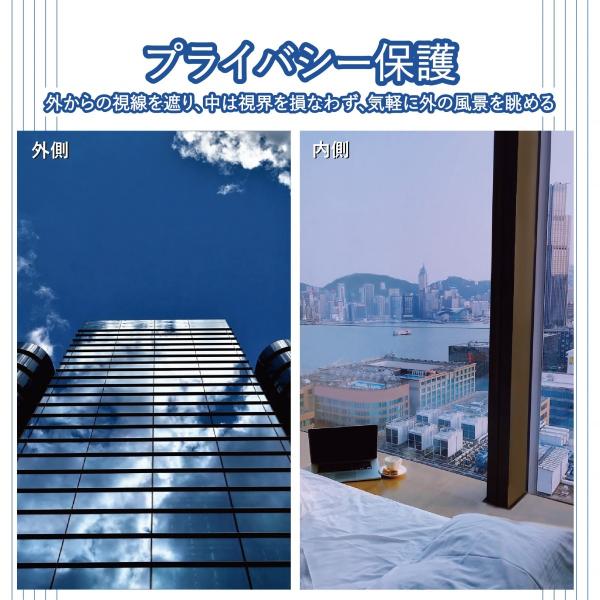 ・【透明ガラスの目隠し、プライバシー保護、防犯シート】外からの視線を遮りながら、充分に外の光を室内に取り込めます。窓ガラス用防犯フィルムとして使えます。ただし、このフィルムはマジックミラー効果あります、マジックミラーとは明るい側から暗い側は透視できないが、その逆は可能な鏡のこと(そのため昼夜見える側が逆転します)