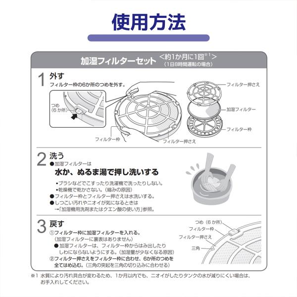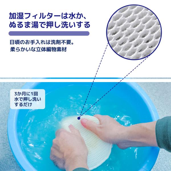 加湿フィルター抗菌、防カビ方法: フィルターに抗菌・防カビ剤を含浸、トレイ内の雑菌・カビの繁殖を抑えます。