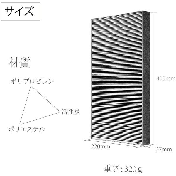 【製品仕様】サイズ:高さ400mm*幅220mm*奥行き37mm 重さ:320g 材質:ポリプロピレン・ポリエステル・活性炭。