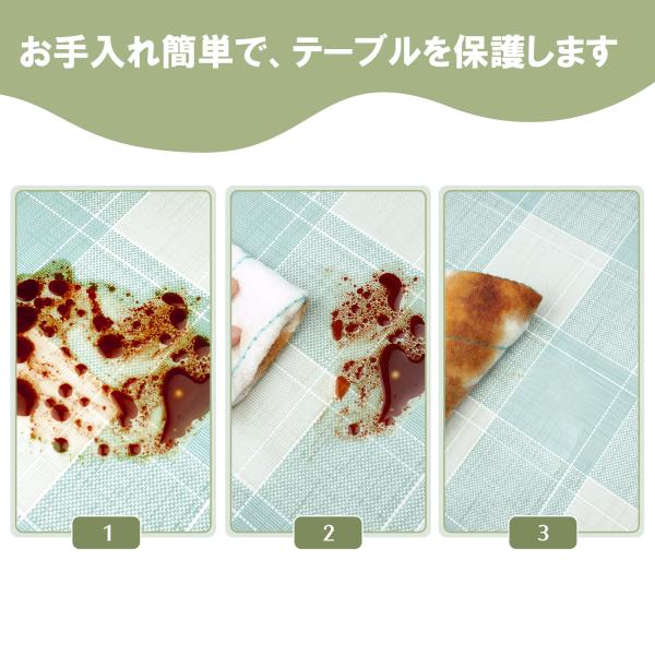 洗いやすい・お手入れ簡単:汚れていても、ぬれた雑巾やスポンジで、すぐ拭いてキレイになりました。布のテーブルクロスに比べて、PVCの材質はカビが生えにくく、浸透防止機能もあります。飲み物やお醤油などをこぼしてしまっても水分が染み込まないので、サッと拭きあげるだけで簡単にお手入れができます。 注意: ・洗濯機で洗濯してはいけません! ・漂白剤は使用してはいけません!
