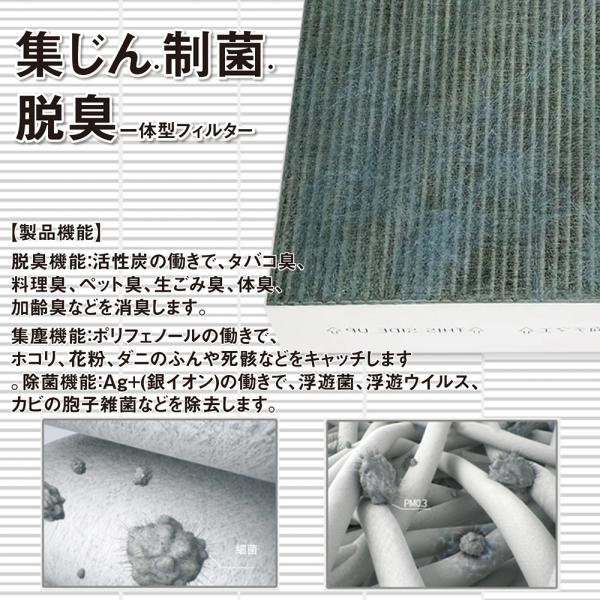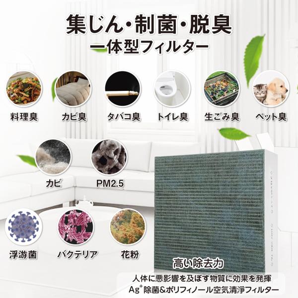 【製品機能】:「集塵機能」ポリフェノールの働きで、ホコリ、花粉、ダニのふんや死骸などをキャッチします;「脱臭機能」活性炭の働きで、タバコ臭、料理臭、ペット臭、生ごみ臭、体臭、加齢臭などを消臭します;「除菌機能」Ag+(銀イオン)の働きで、浮遊菌、浮遊ウイルス、カビの胞子雑菌などを除去します。