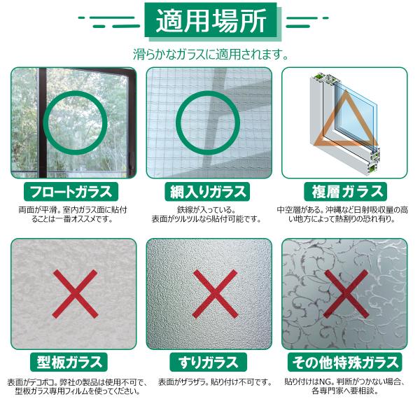 【適用ガラス種類】全ての滑らかな表面(凹凸がない)ガラスに適用です。木材、タイルやすりガラスなど粗い表面と多孔性表面のガラスに適用しません。