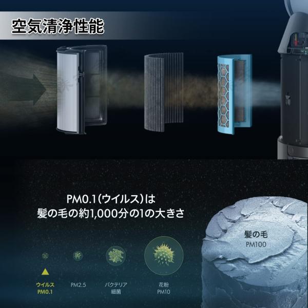 集じんHEPAフィルター機能:360°超細いガラス繊維HEPAフィルターを採用され、粒径0.1μm(100nm)以下の超微小粒子状物質も99.95%除去できます!気密性がよいゴムバッキンで、空気中に浮遊しているウィルス、ホコリ、花粉などのアレル物質をしっかり除去します。