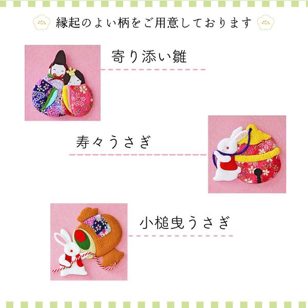 押絵柄は14種類より赤生地上部には桜花柄を、紺生地上部にはこいのぼりの絵柄を配し、どちらも同柄(平安文様)の地紋が織り込まれています。