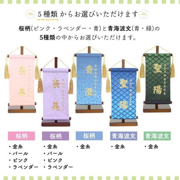 名前旗は「桜柄(ピンク色・ラベンダー色・青色)」「青海波文(青色・緑色)」の5種類の中からお選び頂けます。