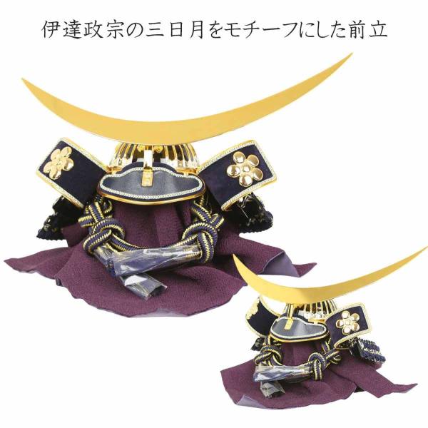 伊達政宗の三日月をモチーフにした前立はおしゃれで人気があり、その特徴的なゴールドに輝く弦月型前立と、紺色の威糸を用いた上質な兜。