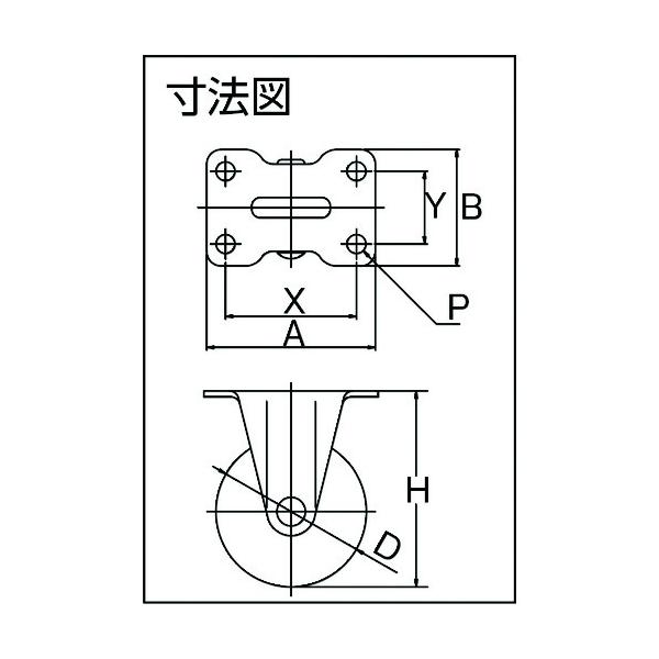 "●標準的な小型キャスターで、最小サイズから取りそろえています。<br><br>●許容荷重(daN):12<br>●許容荷重(kgf):12.2<br>●車輪径D(mm):32<br>●車輪幅(mm):14<br>●取付高H(mm):42<br>●取付座A(mm):36<br>●取付座B(mm):20<br>●取付ピッチX(mm):29(2穴)<br>●取付穴径P(mm):4.2<br>●タイプ:固定式<br>●取付ピッチX×Y(mm):29(2穴)<br><br>●プレート式<br>●固定式<br>●シングルベアリング入<br><br>●金具:スチール<br>●金具表面処理:三価ユニクロ仕上げ<br>●車輪:エラストマー<br><br>●取付穴は2つです。…金物・建築資材 キャスター プレート式樹脂車…"