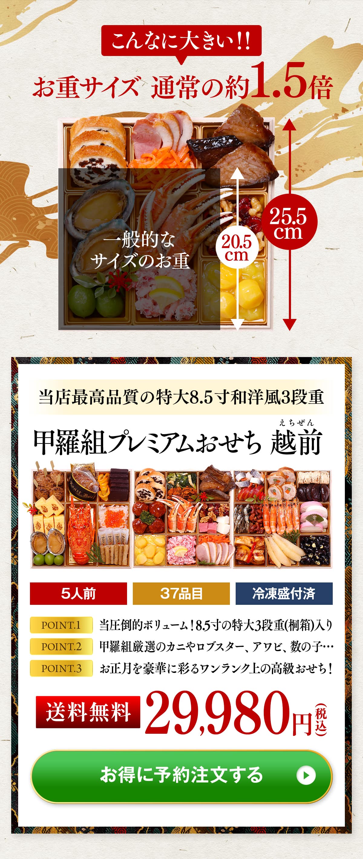 送料無料29,980円!甲羅組プレミアムおせち 越前 特大8.5寸×3段 5人前 盛り付け済 冷凍 主原料に中国産不使用 爆買