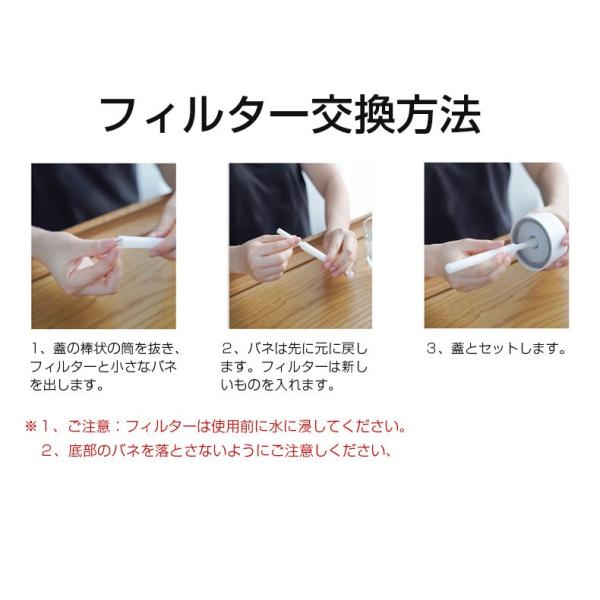 【使用方法】初めてのご使用は、3分間ほど綿棒が水に置いておき、十分に水に濡れましてから、ご使用ください。バネを入れてから、綿棒を入れて、カバーと組立ます。