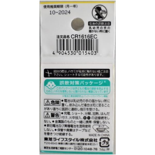 東芝ライフスタイル(株) 製品番 CR1616EC水銀O使用 リチウムコイン電池 誤飲対策パッケージ