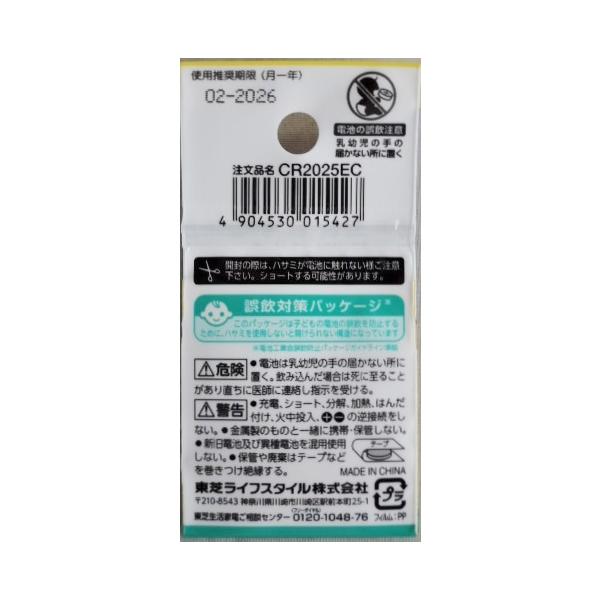 東芝ライフスタイル(株) 製品番 CR2025EC水銀O使用 リチウムコイン電池 誤飲対策パッケージ