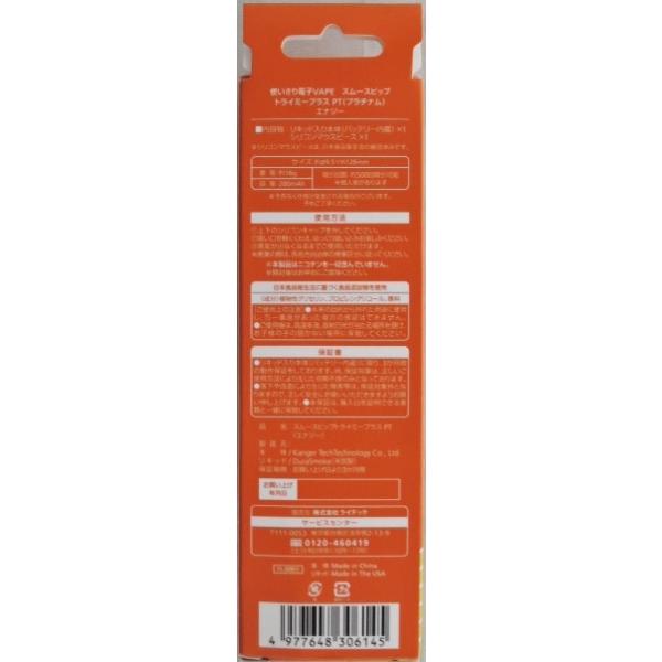 株式会社 ライテック 製品名 スムースビップ トライミープラス PT エナジー電子VAPE NO.1 使い切りタイプ リキッド入り本体(バッテリー内蔵)シリコンマウスピースx1吸引回数 約500回可能(個人差があります)