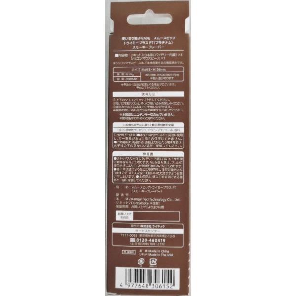 株式会社 ライテック 製品名 スムースビップ トライミープラス PT スモーキーフレーバー電子VAPE NO.1 使い切りタイプ リキッド入り本体(バッテリー内蔵)シリコンマウスピースx1吸引回数 約500回可能(個人差があります)