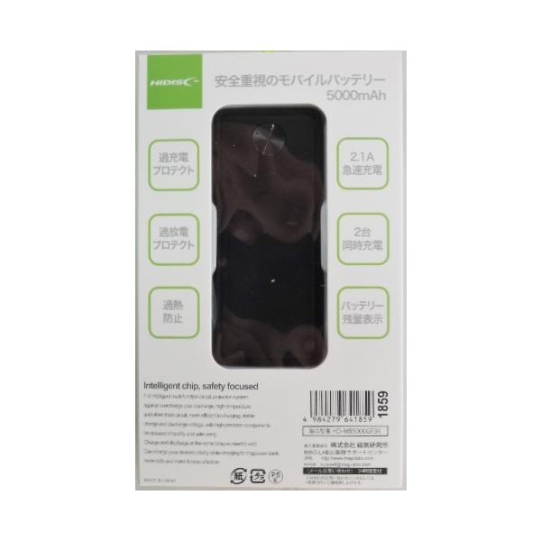磁気研究所 製品番 HD−MB5000GFBKハイディスク モバイルバッテリー 5000mAhバッテリータイプ リチウムイオンポリマー 本体寸法 W51 D13 H119mm入力電流 2.1A microUSB 出力電流1.0A 2.1A Type−A2台同時充電