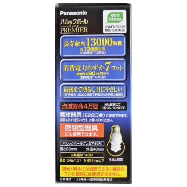 パナソニック 製品番 EFD10ED7H2パルックボール プレミア クール色 40W形寿命13000時間 消費電力7W 点灯寿命4万回口金 26mm 昼光色