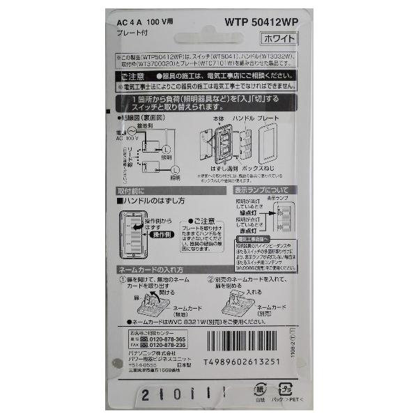 パナソニック 製品番 WTP50412WP埋込パイロットほたるダブルスイッチB 片切1箇所から負荷を 入 切 するスイッチと取り替えられます。照明などのスイッチ AC 4A 100V プレート付 ネームカードを付けられる