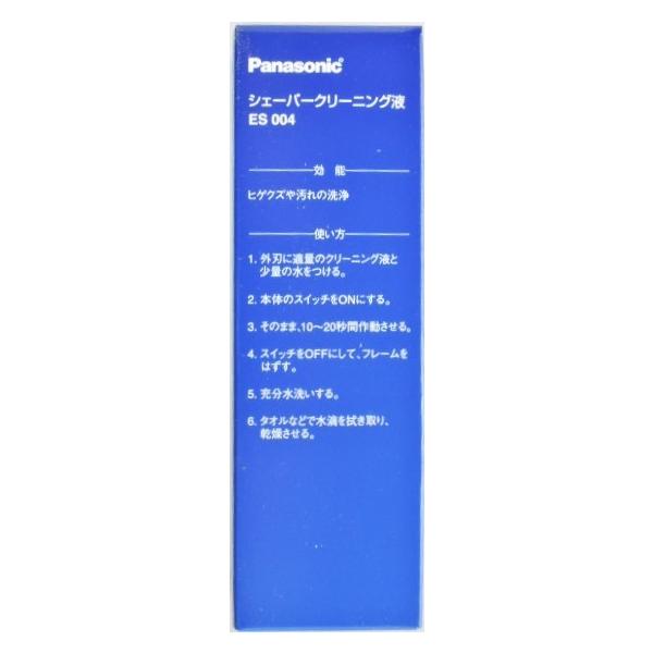 パナソニック 製品品番 ES004効能 ヒゲクズや汚れの洗浄使い方1.外刃に適量のクリーニング液と少量の水をつける2.本体にスイッチをONにする3.10〜20秒間作動させる4.スイッチをOFFにしフレームをはずす5.十分に水洗いをする6.:タオルなどで水滴をふき取り乾燥させる