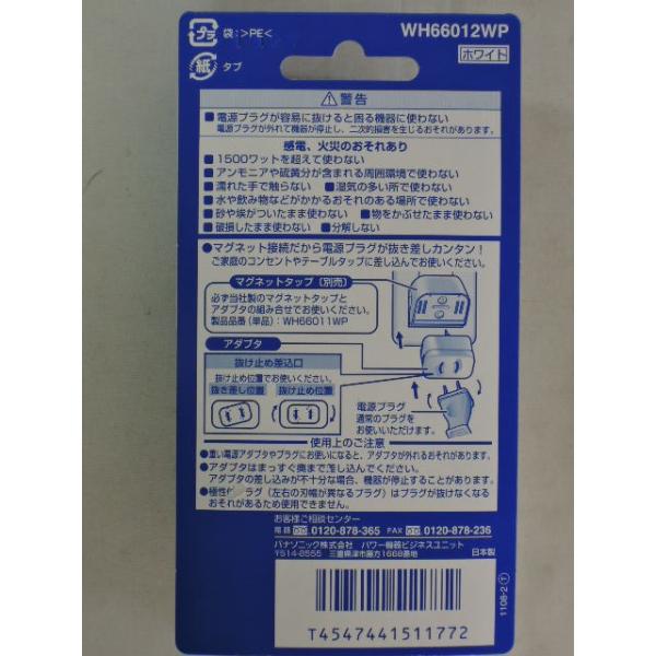 パナソニック 製品番 WH66012WPマグネットコンセント用アダプター 1500ワット以下で使用マグネット接続だから電源プラグが抜き差しカンタンマグネットタップ WH66011WP との組み合わせでお使いください。