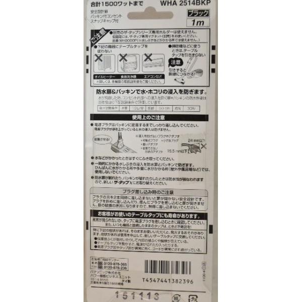 パナソニック 製品番 WHA2514BKP4個口1m タップ 黒安全設計扉 パッキン付コンセント スナップキャップ付合計 1500ワット まで
