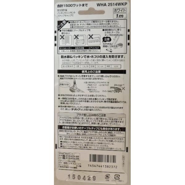 パナソニック 製品番 WHA2514WKP4個口1m タップ 白安全設計扉 パッキン付コンセント スナップキャップ付合計 1500ワット まで