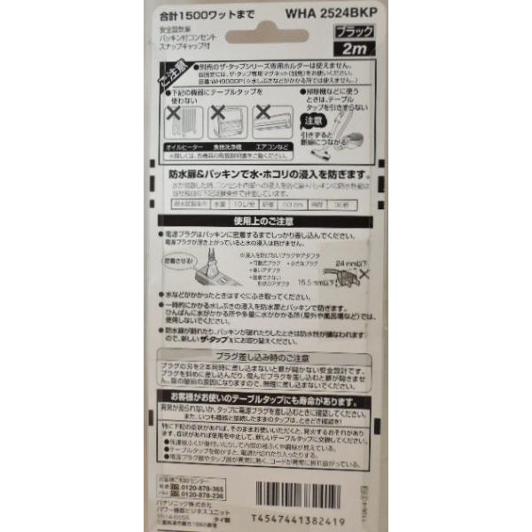 パナソニック 製品番 WHA2524BKP4個口2m タップ 黒安全設計扉 パッキン付コンセント スナップキャップ付合計 1500ワット まで