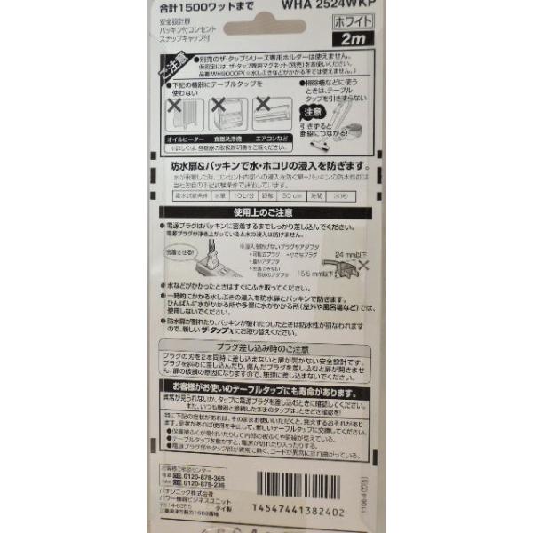 パナソニック 製品番 WHA2524WKP4個口2m タップ 白安全設計扉 パッキン付コンセント スナップキャップ付合計 1500ワット まで