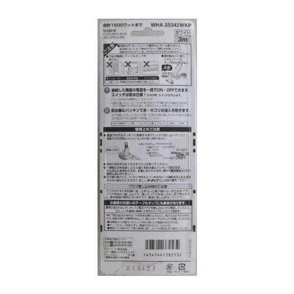 パナソニック 製品番 WHA25342WKP4個口3m タップ接続機器を一括ON OFF できます。スイッチは防水仕様安全設計扉 パッキン付コンセント スナップキャップ付合計 1500ワット まで