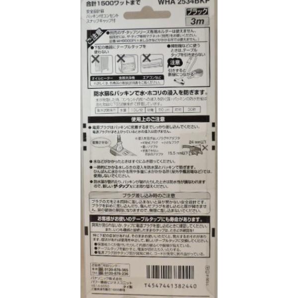 パナソニック 製品番 WHA2534BKP4個口3m タップ 黒安全設計扉 パッキン付コンセント スナップキャップ付合計 1500ワット まで