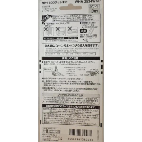 パナソニック 製品番 WHA2534WKP4個口3m タップ 白安全設計扉 パッキン付コンセント スナップキャップ付合計 1500ワット まで