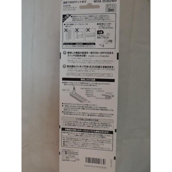 パナソニック 製品番 WHA25362WP6個口3m タップ接続機器を一括ON OFF できます。スイッチは防水仕様安全設計扉 パッキン付コンセント スナップキャップ付合計 1500ワット まで