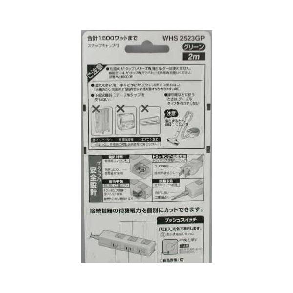 パナソニック 製品番 WHS2523GP3個口2m グリーン接続機器の待機電力を個別にカットできます。発熱対策 発熱しにくい高電導材採用トラッキング 感電対策 ユリア樹脂+感電防止被ふく焼損予防 熱に強い二重ボディー 丈夫なコード&根本