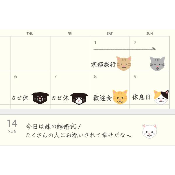 「ネコ柄」は、その日の気分に合った表情のシールを選んで貼ります。ネコの表情が暗くなってきたら、ストレスがたまっているので体を休めるなど、体調管理に役立てることができます。再剥離シールなので、気分が変わっても貼り直しOK。