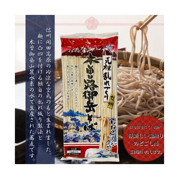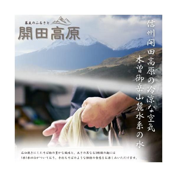 信州開田高原の冷涼な空気のもとで、麺に凸凹をつける独自の乱れ織り製法と、木曽御岳山麓水系の水で生産されたそばです。張り付きをおこしにくい麺が、新しい歯触り、のどごし感が魅力なそばになります。