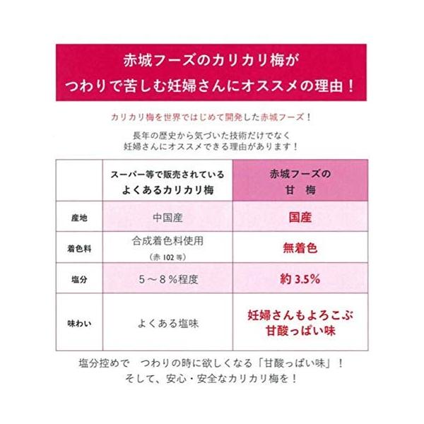 原材料:梅(国産)、漬け原材料〔食塩、醸造酢、酒精、果糖ぶどう液糖、りんご酢〕 酸味料、調味料(アミノ酸等)、乳酸カルシウム、香料、甘味料(アセスルファムK)、みょうばん