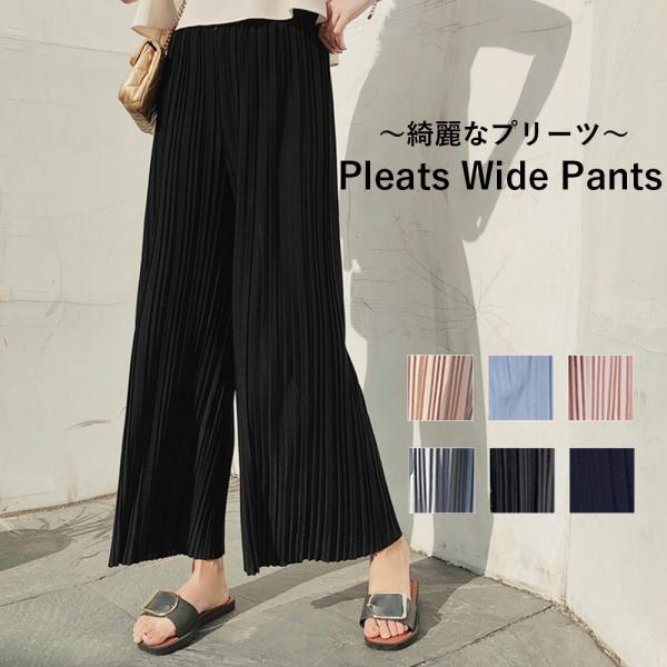 シフォン ワイドパンツ プリーツ ウェストゴム ロング丈 パンツ ガウチョパンツ ボトムス プリーツパンツ 春 夏 レディス