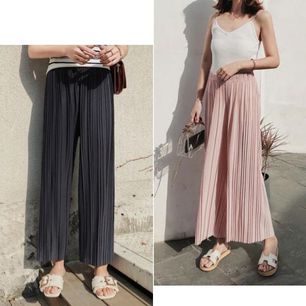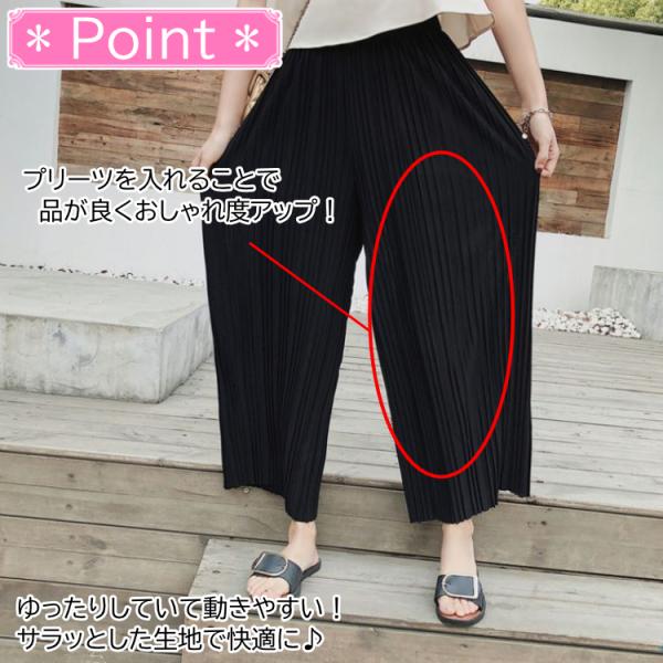 シフォン ワイドパンツ プリーツ ウェストゴム ロング丈 パンツ ガウチョパンツ ボトムス プリーツパンツ 春 夏 レディス