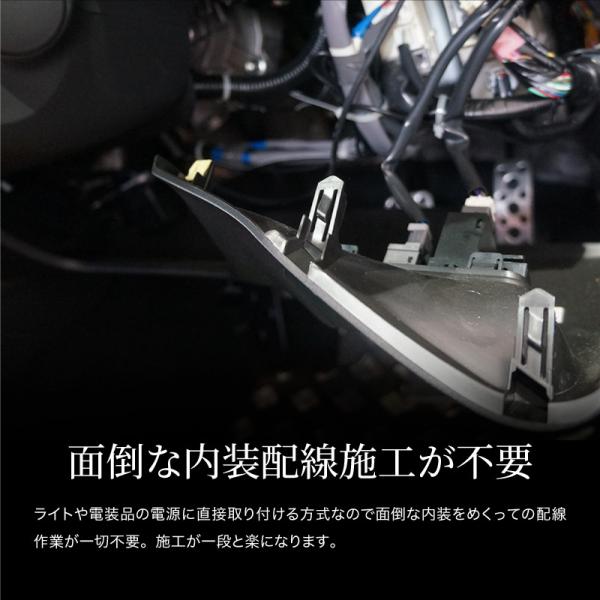 デイライトやイカリング、LEDテープなどのLED製品などと接続する事で、車内から付属のスイッチでLED製品のON/OFFが可能になります